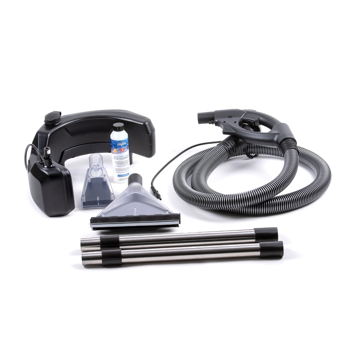 O Kit Extração de Manchas SEK vem com uma variedade de acessórios para facilitar alimpeza de diferentes superfícies. Ele inclui um bocal grande, especialmente desenhado para tapetes e carpetes, equipado com escova e rodo removíveis, que também pode ser utilizado para limpar pisos frios, vidros, azulejos e outras superfícies. Um bocal menor é fornecido para a limpeza eficaz de estofados. Além disso, o kit contém uma mangueira da extratora, tubos prolongadores de altura em aço inox, um tanque (reservatório) de água para a extratora e um Agente de Limpeza. Estes acessórios foram cuidadosamente selecionados para oferecer uma limpeza versátil e eficiente, tornando o Kit SEK um complemento valioso para a sua extratora de sujeira Vivenso Smartcleaner.